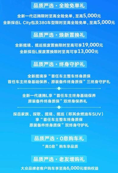 目前,一汽-大众还针对大众品牌车型推出“品质严选”限时福利,涵盖全险免单、置换补贴、0息购车等权益,诚意满满。