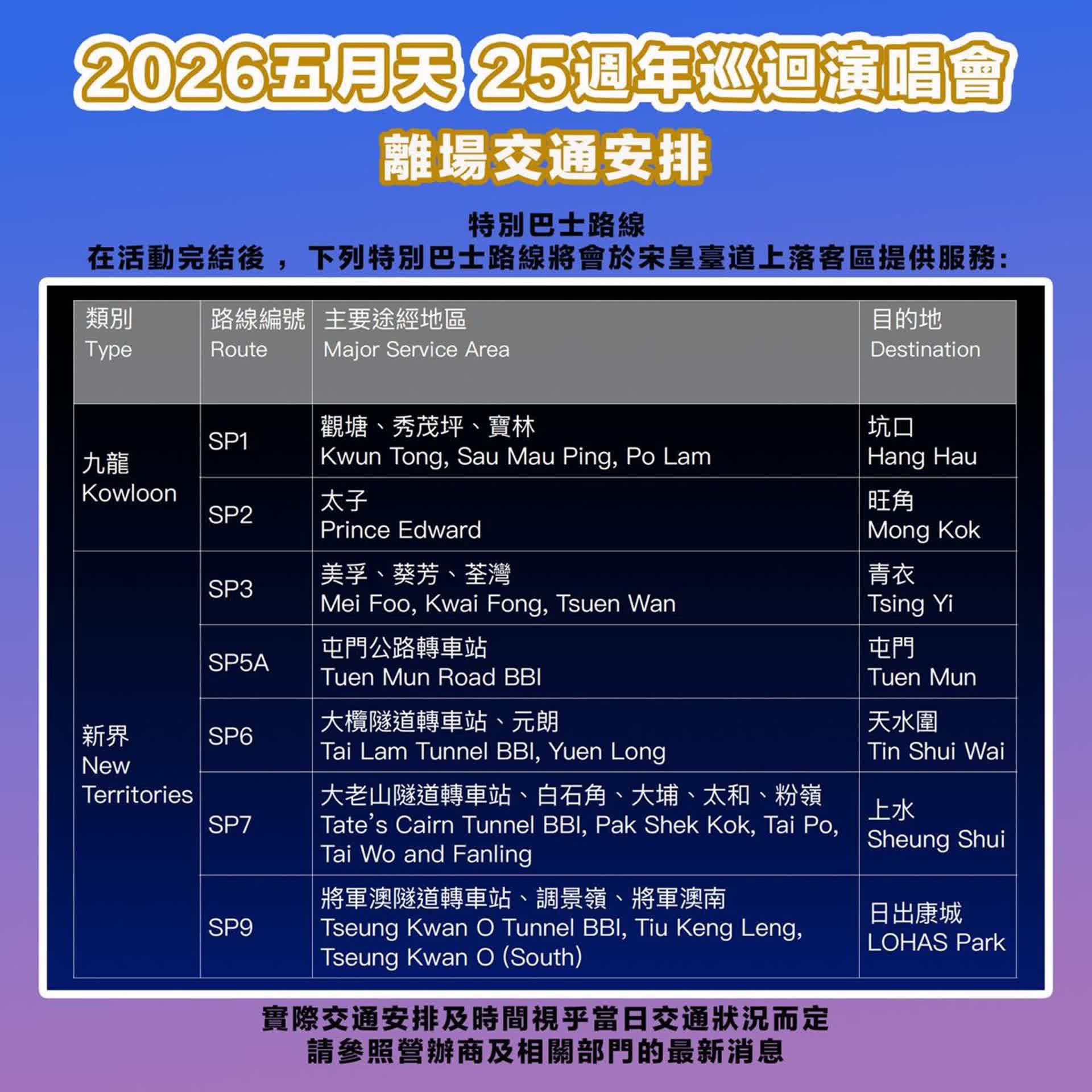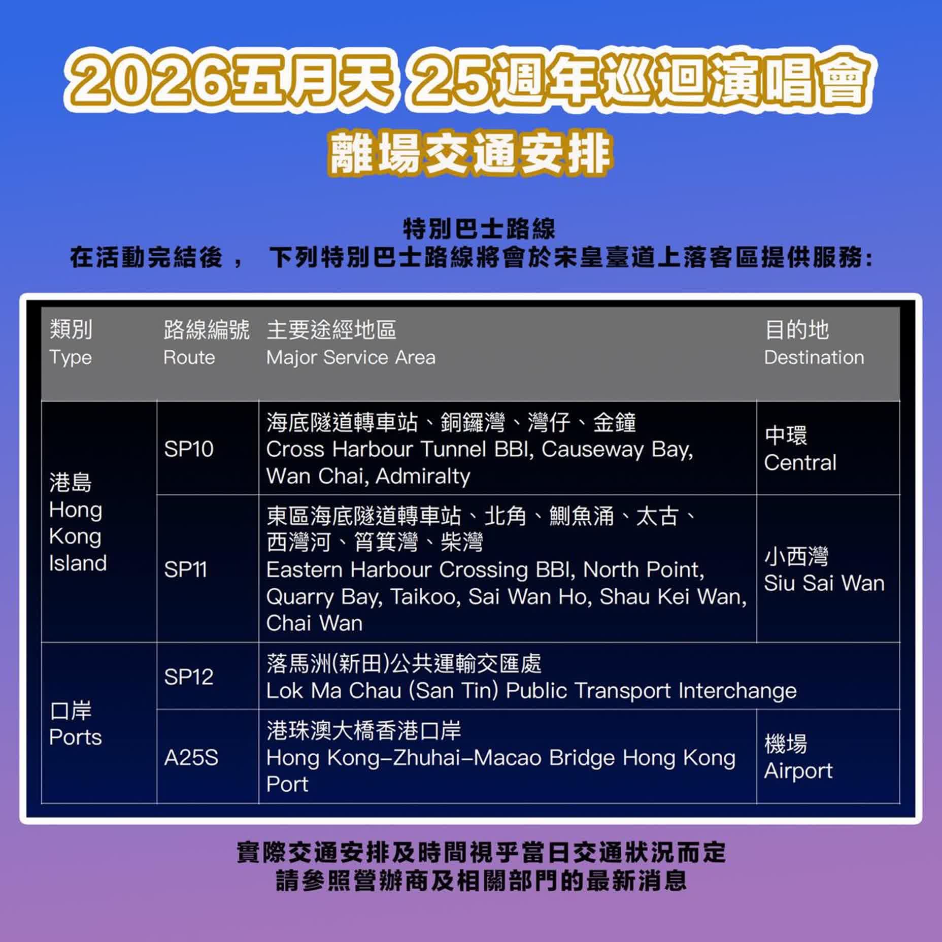 2. 演唱會預計於晚上10時30分結束,散場時交通選擇如下: