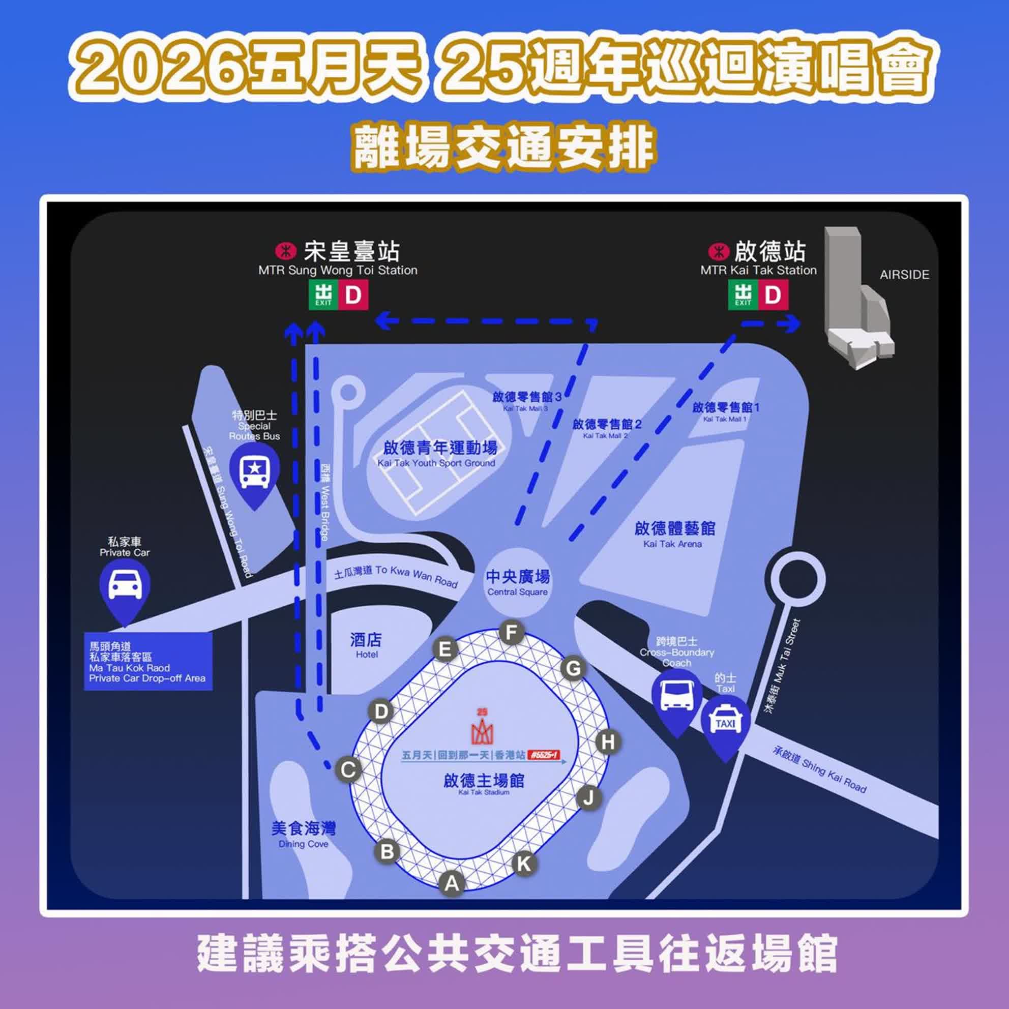- 建議優先使用公共交通工具(港鐵/巴士)前往啟德體育園
