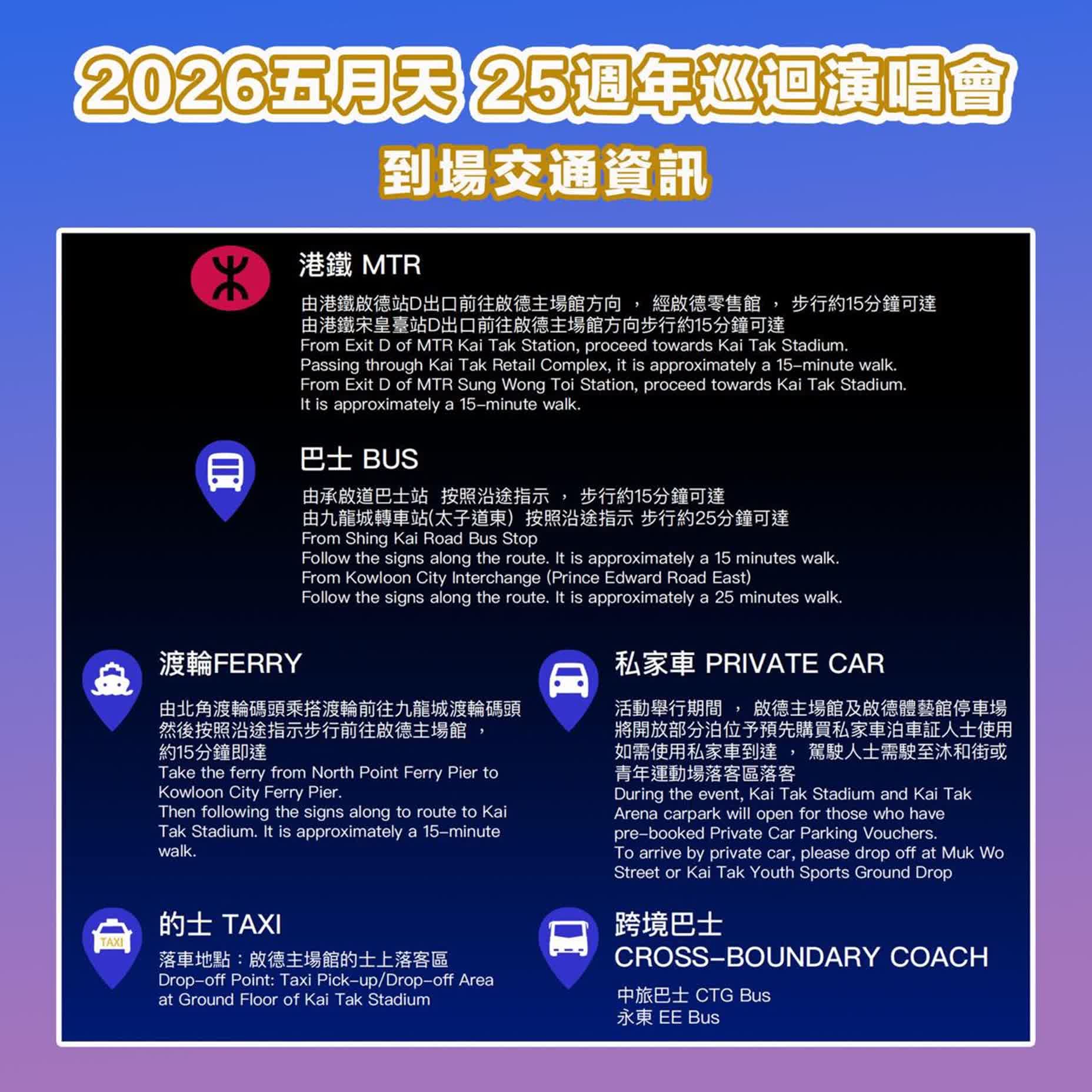 - 演唱會將於晚上7時開始,請提早抵達會場,避免擁擠