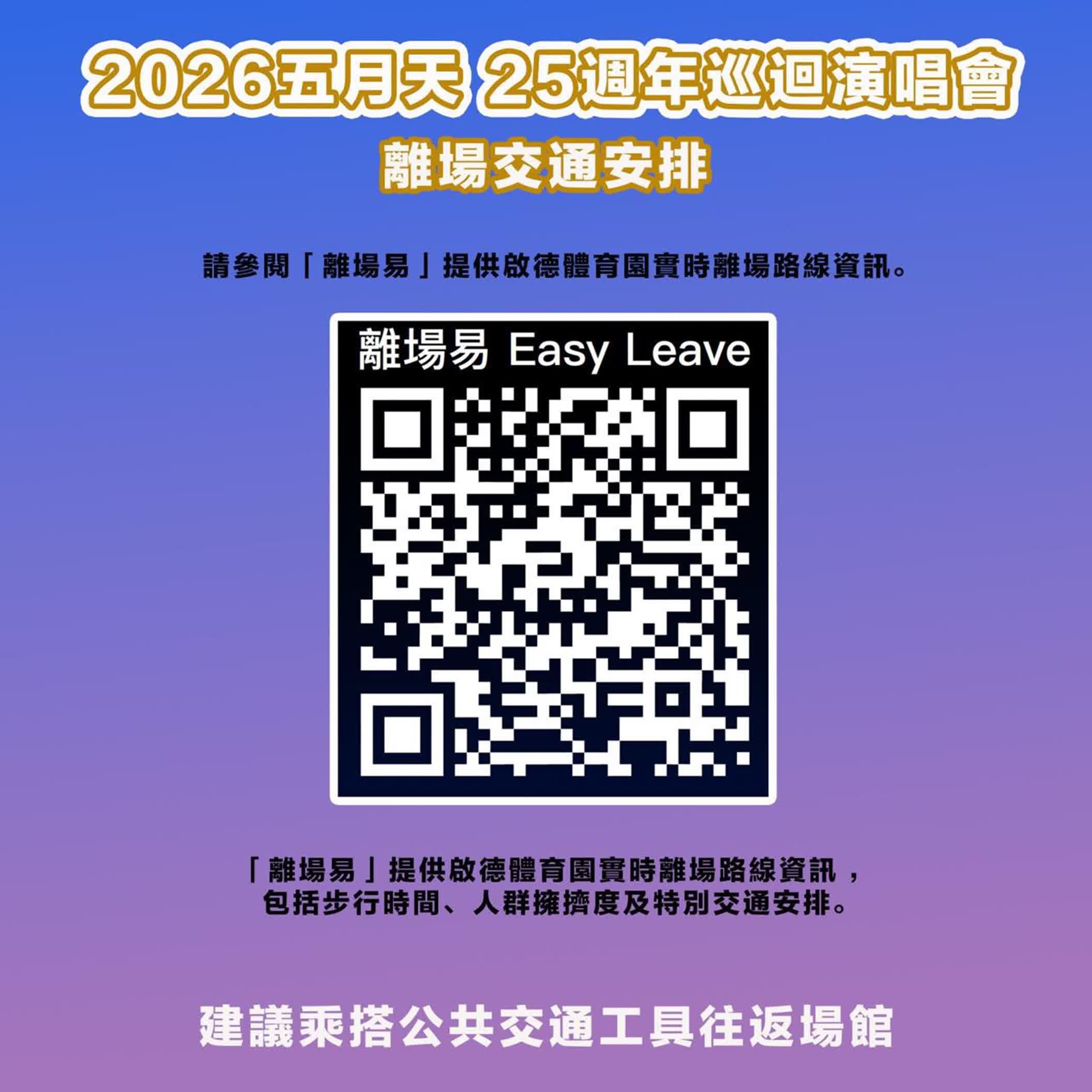 3. 散場時可使用實時離場系統「離場易」系統查看:(到時候場館內外的電子顯示屏都會顯示「離場易」QR code)