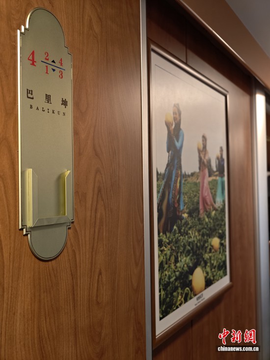 穿行在车厢中间,处处可见新疆的浓浓风情。秉持“一车一风景”的理念,车厢内每个房间均以新疆知名景区命名,房间门口还张贴着对应景点的美食美景海报,让游客未至景区,先浸风情。