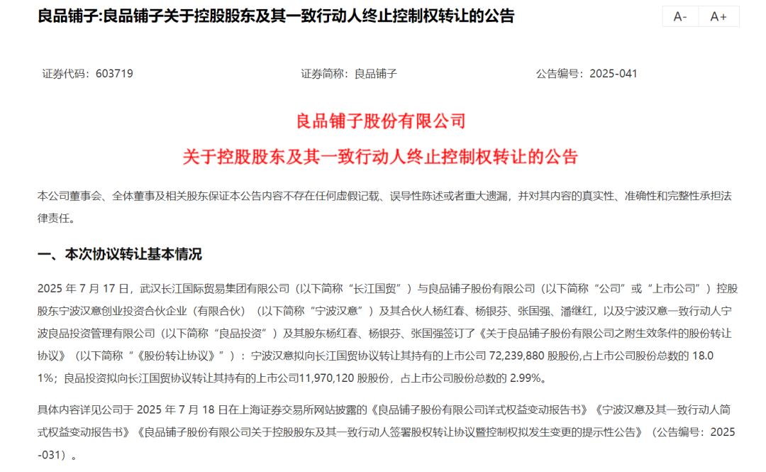 10月16日晚间,良品铺子发布公告称,近日,公司收到控股股东宁波汉意及其一致行动人良品投资函告,截至与长江国贸签署的《股份转让协议》约定的最终截止日,协议约定的生效条件未能全部成就,本次《股份转让协议》于10月15日终止。