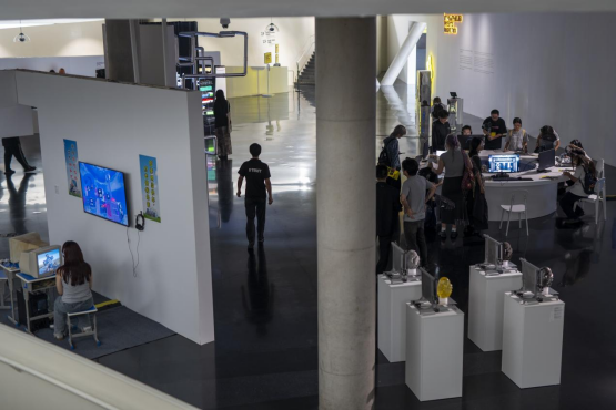 第一单元中,很多作品也体现了艺术家们关于“赞成票”的问题和对“再建域”模式的思考。中国美术学院开放媒体系学生创作的“社会游戏”系列作品当中,《你付宝》以黑色幽默的方式反思AI扫脸支付技术在现实当中的问题,游戏中,你扮演一个准备利用自助结账机的扫脸支付功能逃单的顾客,通过大叫与躲避,看准时机,吸引身后无辜的路人转头,让ta为你刷脸买单。作者通过这件作品重新唤醒“扫脸”日常性所隐含的风险。当机器总是先你一步投出“赞成票”时,是否意味着个体正濒临失控?