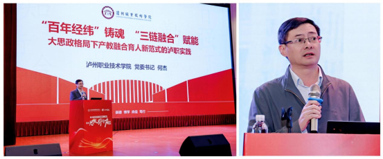 泸州职业技术学院党委书记、成渝地区双城经济圈(泸州)商学院党委书记何杰以《“百年经纬”铸魂,“三链融合”赋能:大思政格局下产教融合育人新范式的泸职实践》为题作报告,分享泸州职业技术学院实践。介绍了锚定大思政与产教融合统一的根本,通过建强协同链破解资源困局、贯通过程链深化思政内涵、拓展空间链彰显思政价值的“三链融合”路径,介绍了其取得的显著成效,展望了未来深化校史赋能、数字升级等方向,为产教融合育人提供范式。