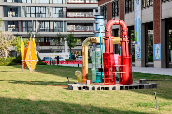移步至悬吊空间左侧草坪(C区),艺术从室内延展至自然之中。户外装置与绿地景观相映成趣:《申城叠影》以折叠屏风造型隐喻城市的流动与生长;《风的漫游》与《管见之荡·循环新生》在开阔空间中与观众形成互动;《浮光梦蝶》与《共襄美好》则营造出诗意与科技交融的视觉现场,邀请观众在漫步中邂逅艺术与自然的对话。