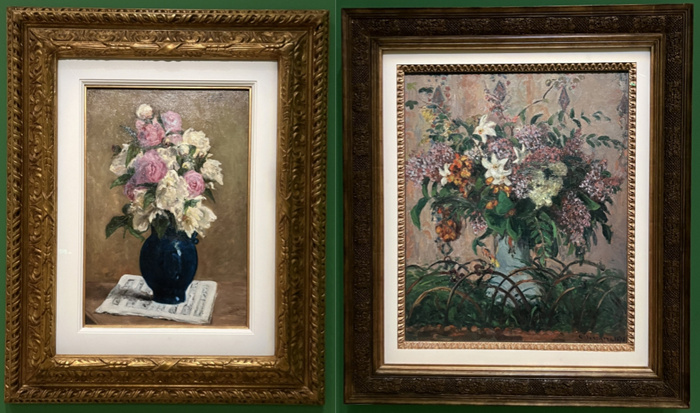 左:保罗·高更(1848-1903,法国),《乐谱上的牡丹花束》,1876;右:卡米耶·毕沙罗(1830-1903,法国),《丁香花束》,1876