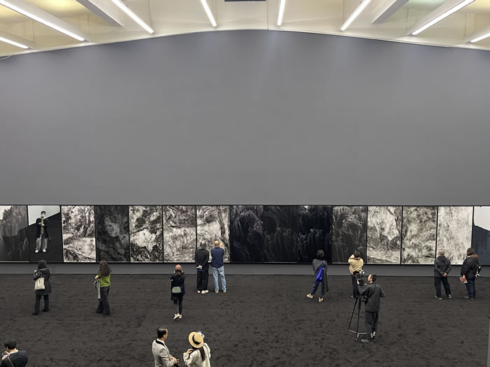 展览空间以“迷宫”“城楼”“广场”等多种象征性空间形态为结构,配以黑白与多层次灰色调,形成既具秩序感又充满诗意的场域。此外,艺术家拒绝设定单一的观展路线,通过多通道与多向的空间布局,让观众在展厅中或徘徊、或折返,甚至迷失方向,仿佛没有固定的起点与终点。光线的运用强化了这种错位的体验,使影像叙事与空间叙事共同指向一种模糊而多维的身体感知。