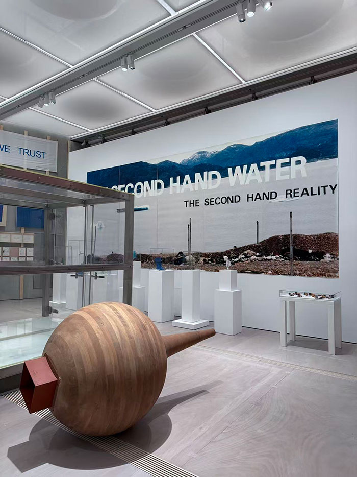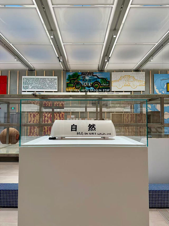 《自然是一辆出租车》试图表达,人类使用自然,正如使用出租车:招手即停,按需付费,下车即忘。自然被简化为一种可计量的、工具性的服务。在场馆之外,水镜广场也被纳入展陈空间,一辆杭州本地出租车停泊其中,抽象的生态危机就这样锚定在一个习以为常的具体物件上,迫使观众反思自身与自然环境那种功利性的、缺乏敬畏的关系。