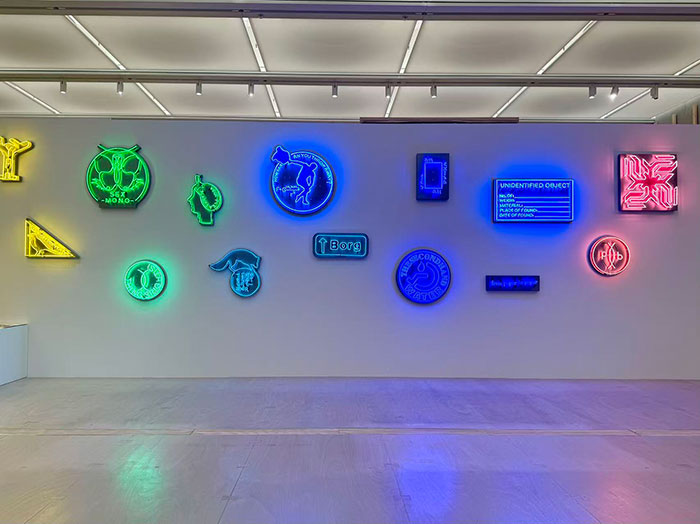 步入展厅,观众首先被前厅数十个多彩的霓虹灯Logo所包围,它们如同闪烁的思维节点,暗示了此次展览的观念线索。吴山专与英格-斯瓦拉·托斯朵蒂尔自1990年代合作伊始,便以语言作为首要的批判材料。他们提出了“回答先于提问”的洞见这种对语言结构的怀疑,在作品 《完美的括号》 中得到了极致的体现。