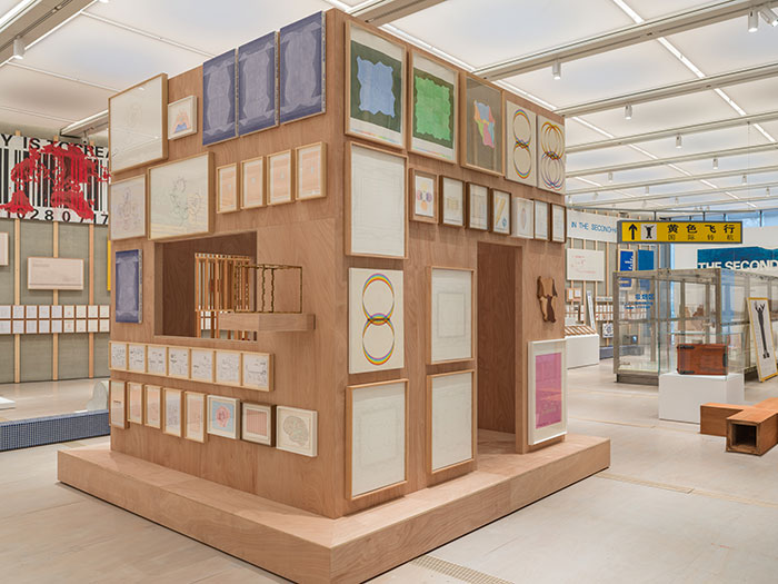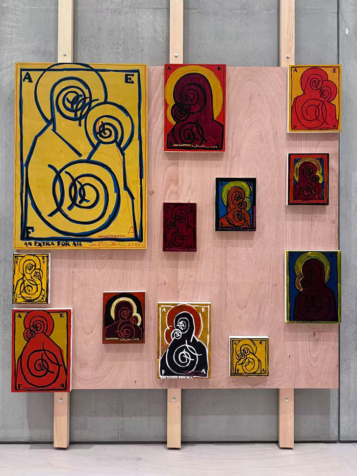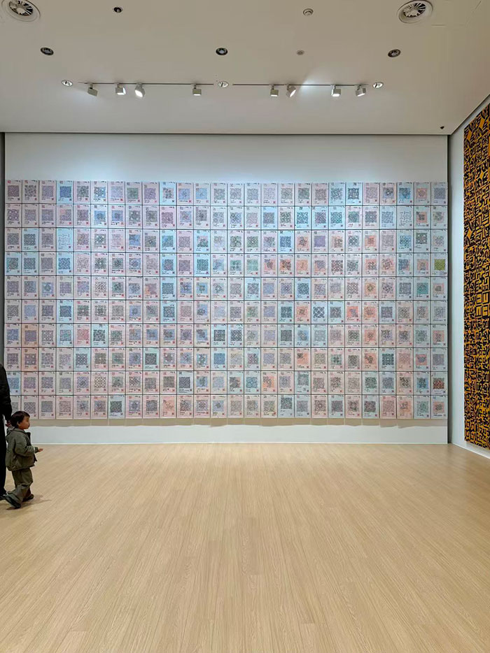 而在吴山专的个人作品部分,对语言的实验走向了更具东方哲学深度的层面。他的 《心经》 系列作品,将这部深邃的佛教经典进行了视觉转化。正如导览所述,他并非抄经,而是“译经”——将每一个汉字旋转、拼接,转化为类似“卍”字符号的图腾单元,甚至为每个字生成了独特的“二维码”。这一过程,是语言从表意到形式,再从形式到图像的跃迁。文字的意义被暂时搁置,其视觉的、结构的、甚至数字化的潜能被无限放大。这既延续了吴山专自“八五新潮”以来对汉字的长期痴迷,也让我们思考:在当代语境下,古老的智慧将以何种形态得以传承和显现?是恪守其义,还是解放其形?这无疑是艺术家在“出世”的哲思与“入世”的传播之间所做的巧妙平衡。