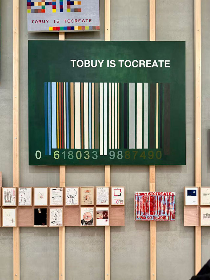 颜色和尺寸来自于马奈的《草地午餐》。条形码与流通消费相关,该作品代表着将无形的钱转化成观念艺术 《买就是创造》 摄影/李芷葳