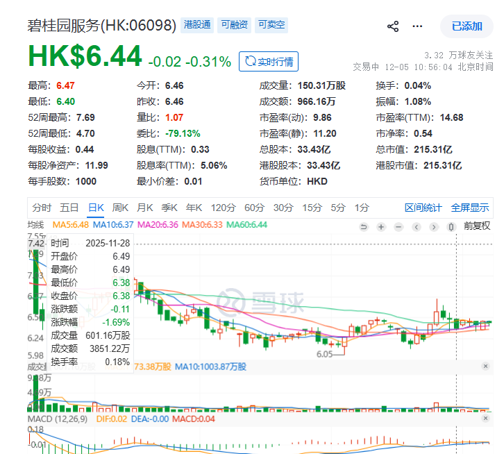 截至发稿,碧桂园服务股价报6.44港元/股,总市值为215.31亿港元;蒙牛乳业股价报14.49港元/股,总市值为564亿港元。