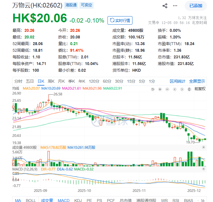 2022年9月29日,万物云正式登陆港交所,当天股价收盘报46港元每股,跌破发行价约6.79%。截至12月5日上午9:56,万物云总市值为231.8亿元。