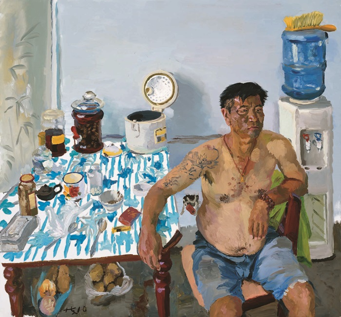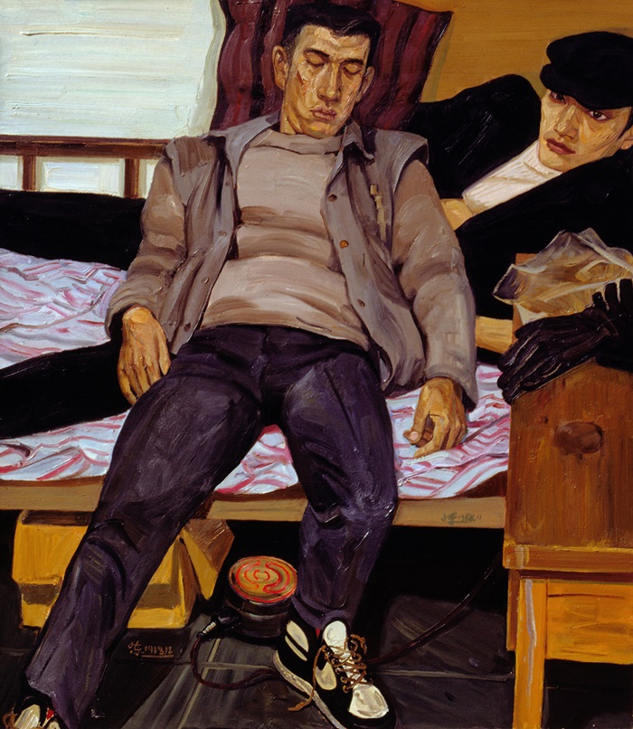 作品中经常出现有象征意义的物品,用策展人的话来说,总有一些元素打破画面中的平衡,为画面注入独特的意味,强化了人物的内心活动。这一手法也贯穿了他之后的创作。比如《休息》中脚下的电炉、《心乱的男孩》桌子上杂乱的颜料与药品。刘小东的绘画构建了独特的精神世界。