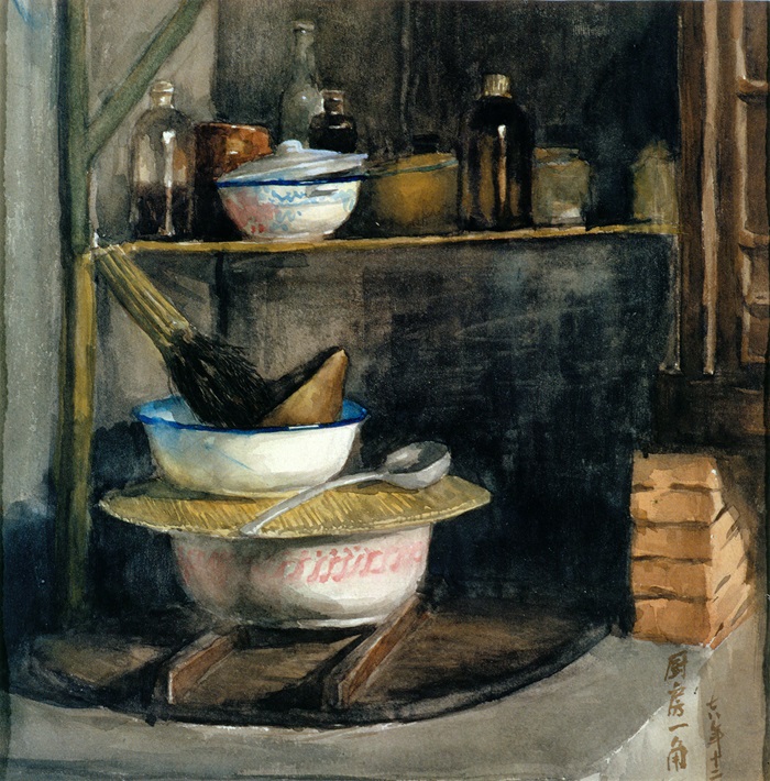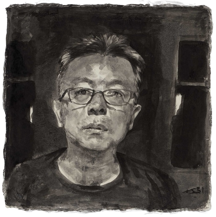 《厨房里的自画像》,纸上水墨,2021,31×31cm