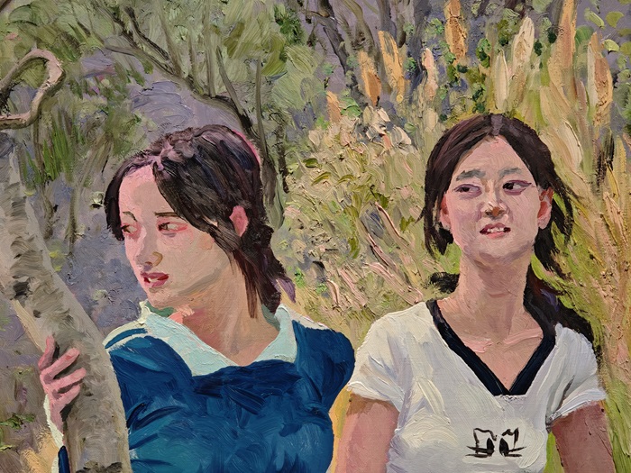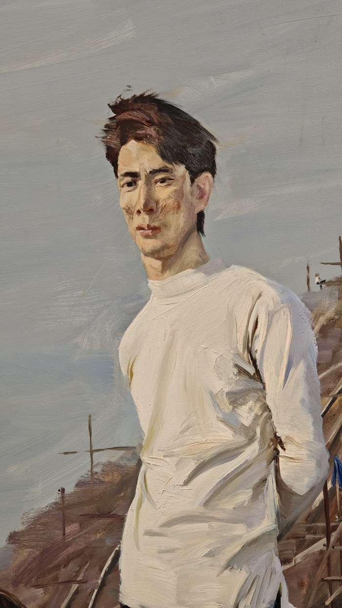 在2025年的新作中,他又去了底特律这座曾经辉煌的“钢铁之城”。《底特律雪光》是一场装扮游戏,是寒冬中的战斗,是对中世纪的模仿,他们把身体隐藏在保护之下,整幅画只有一张露出的脸。他觉得油画是一种古典的媒介,很适合画金属。他还用多层叙事表现事件的推移。《天门关》展现了太行山区新一代青少年的形象。他改变以前印象派的色彩体系,转而表现主观的固有色,但他仍然展示出控制色彩关系的强大能力,洋溢着青春感。