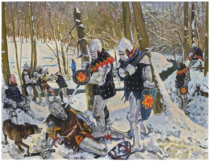 从这一时期开始,他作品的尺幅也变得越来越巨大,风景、环境在他的画中占据了更多的空间。显然,他更突出人物与环境的互动关系,更试图从环境的角度来理解个体,让环境反向烘托人物,继续诉说“剧情”的发展。这些场景中埋藏着非常多的信息,需要观者仔细品读。这种场景-人物的模式也延续至今。