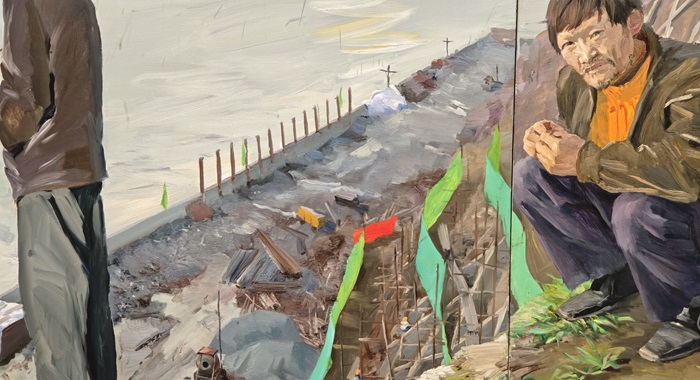 在《三峡新移民》中他借鉴了李公麟《海汇图》的V形构图,大面积留白,视野开阔,描绘了蓄水后烟波浩淼的三峡工地,主角是曾在此生活的普通人,包括玩耍的孩子,有些人好奇地看向观众,似乎对这个超级工程浑然不知。刘小东把他们从生活的环境中抽离,放进场景中。他在创作时也会参考照片素材,因此会发现人物会有一种与画面的“缝隙”和跳脱感,半空中突然出现一只野鸭,这恰恰是刘小东想要展现的超现实一面,使他所描绘的现实更加多维度地展开。