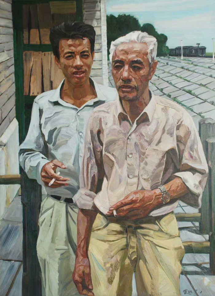 《父子》,亚麻布油画,1989,130×97cm 承蒙刘钢、陈育夫妇惠允