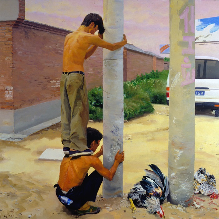 《抓鸡》,亚麻布油画,2003,200×200cm 承蒙私人藏家惠允