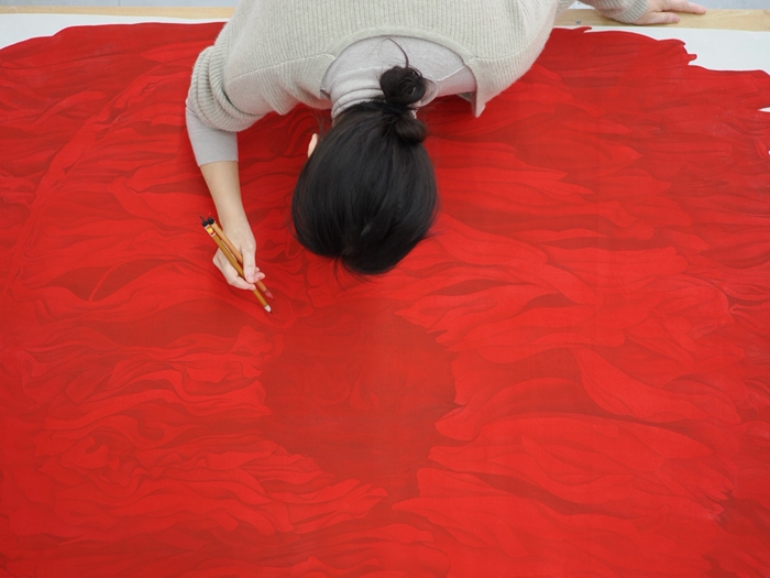 康春慧目前的绘画创作涵盖了两个主要方向。一方面,她通过层层叠加的红色颜料,创造出天鹅绒般的质感,这便是以牡丹形态为基础的《须弥》系列。另一方面,她的另一部分作品则在色调上更为空灵,且表现性更强,主要采用工笔技法,传统上用于人物、动物和建筑的细致描绘。《隐逸的主角 No.2》(2022–2024)就是其工笔作品之一。在《须弥》系列中,那种令人陶醉的天鹅绒般的红色传达了牡丹花所象征的灿然荣耀。牡丹自隋唐以来便在中国文化中占据崇高地位,常被誉为“富贵荣华”,被视为花中之王,并在各种仪式中加以使用。