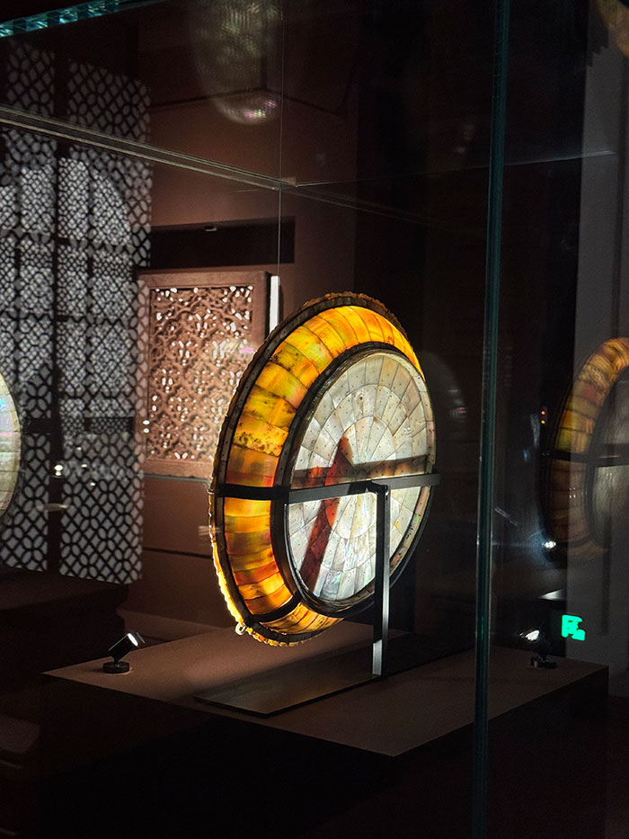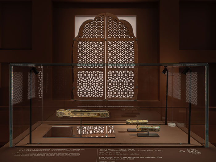 来自三个帝国的展品总体共同呈现的是以伊斯兰文化为基调的美学,有着繁复细密的装饰图案,所以展览主题为“图案的奇迹”。这些装饰图案以有序又无限展开的方式排列,其元素运用于建筑上的效果最为显著而令人惊叹,如遍布伊斯兰国家的清真寺便是如此,内部空间尽力展现“光”——幽暗中的“光”。展览的展陈有意将这些细致的珍宝以珠宝柜级的打光呈现。“珍奇柜”来自英文“Cabinet of Curiosities”,最早是欧洲贵族们陈列自己搜罗来的好奇小玩意儿,如自然标本、小文物、艺术品等,用作秘藏或限定展示。这也是后来现代意义上“博物馆”的原型。