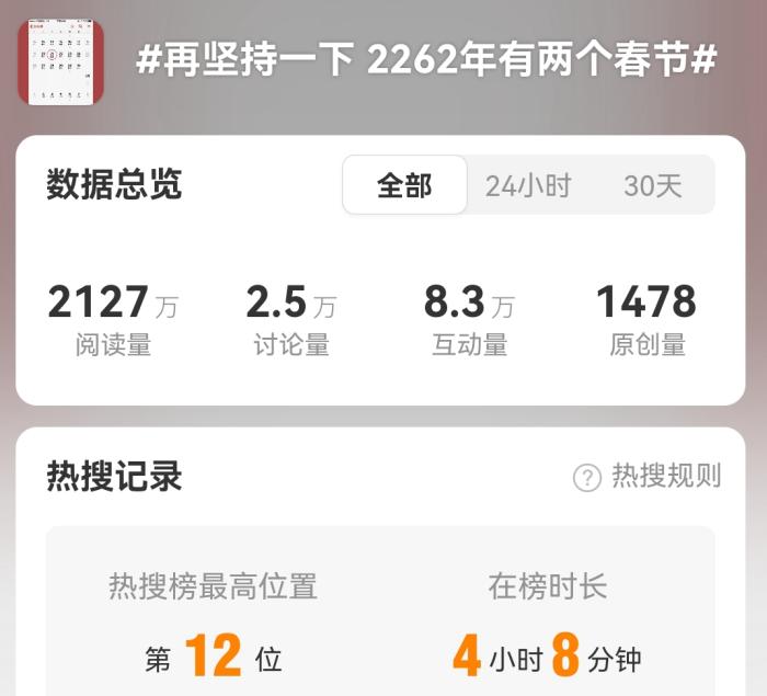 中新网北京12月24日电 (记者 上官云)“再坚持一下,2262年有两个春节!”前不久,当这个消息被刷上热搜后,很快在社交平台上掀起一场热议,有人调侃:能不能放两次假?