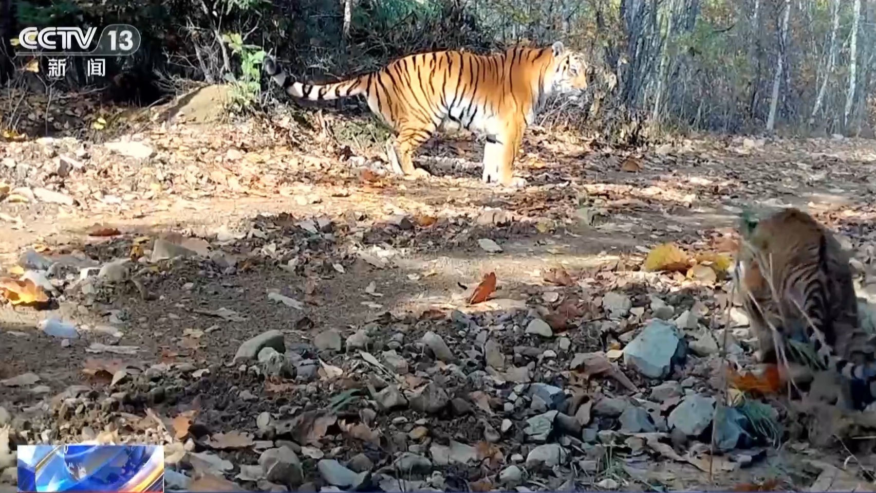 记者从东北虎豹国家公园管理局监测中心了解到,今年由预警相机拍摄到的一虎带四崽、一虎带五崽东北虎家庭活动的地点之间,直线距离约为5公里,仅隔着几道山岭,且都在村屯的附近。