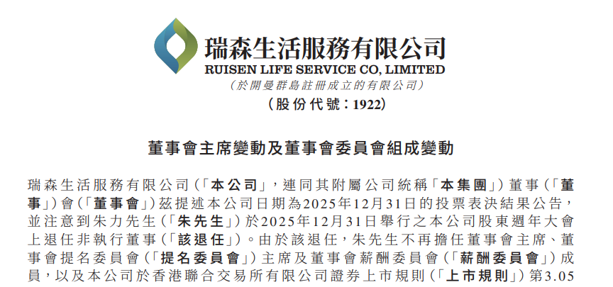 值得关注的是,2025年11月3日,瑞森生活服务发布公告,宣布一系列董事会成员变动及委员会职务调整。公告显示,谢晨光有意退休并专注于其个人事务而辞任执行董事及董事会主席;朱力已获委任为董事会主席,并由非执行董事调任为执行董事,朱力已获委任为提名委员会主席及薪酬委员会成员。
