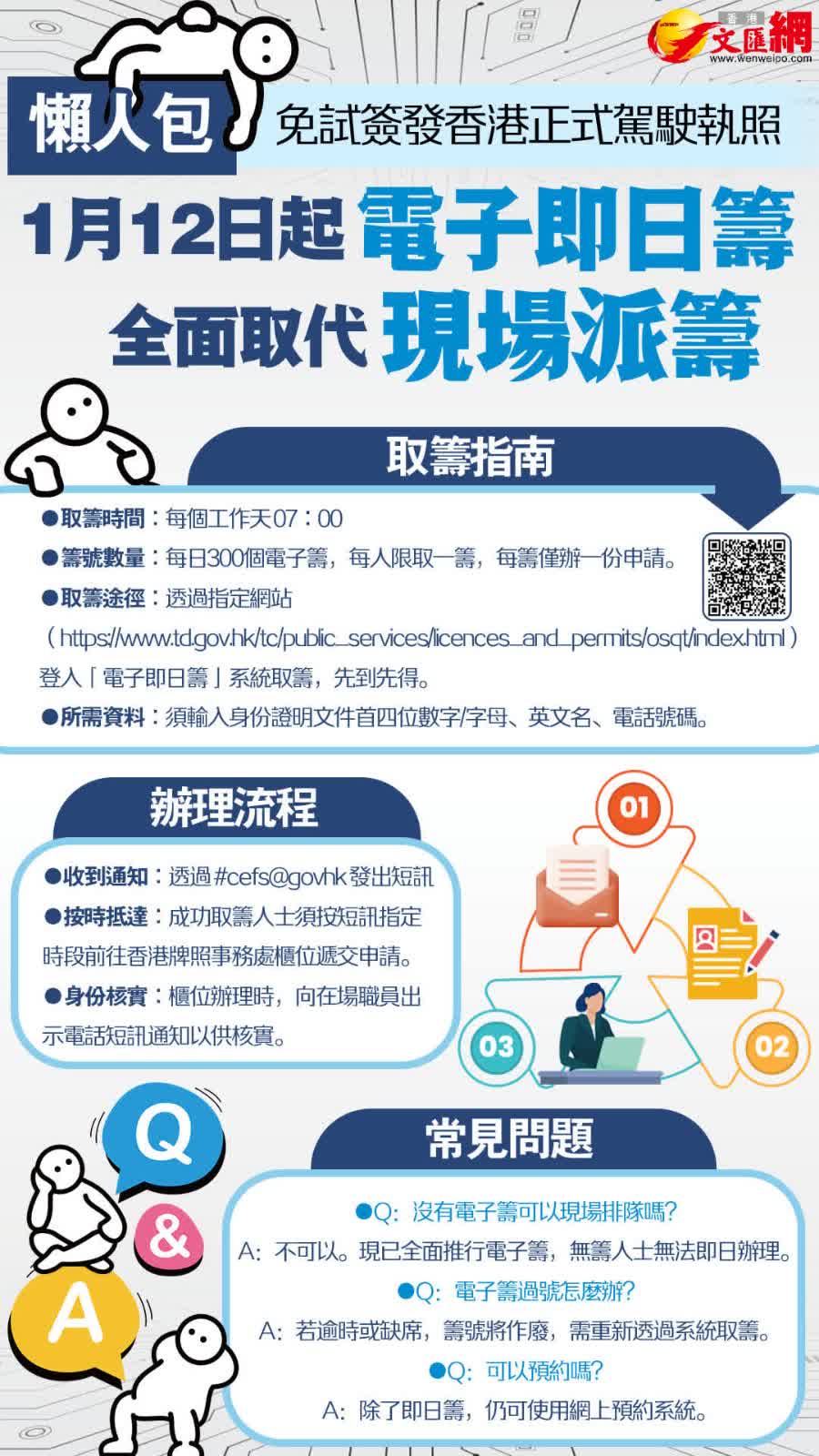 香港文匯報訊(記者 蕭景源)為打擊排隊黨疑因粵車南下等政策推出再度猖獗問題,取消現場派籌安排轉用「電子即日籌」。運輸署「免試簽發」牌照申請今日(12日)首日改發電子即日籌,全部300張籌約半小時派完。