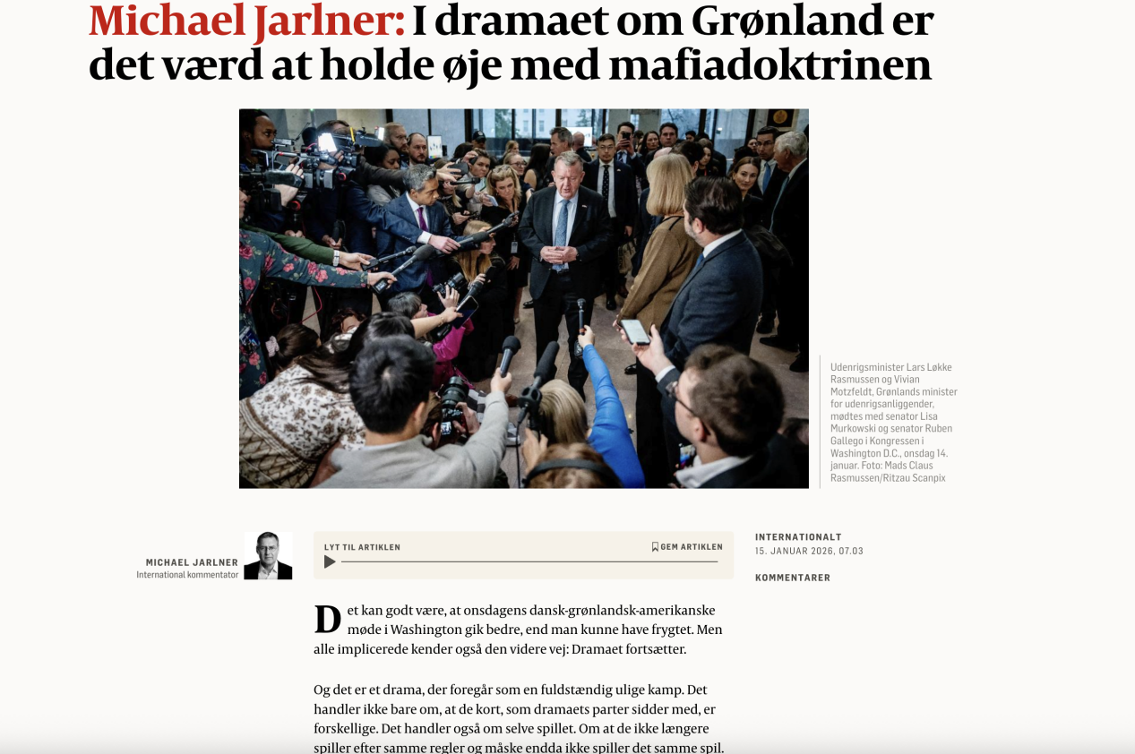 丹麦《政治报》报道称,丹麦和格陵兰岛方面的谈判代表与美方未能就此达成一致,所有与会人员都清楚未来的走向,那就是这场风波仍在继续。而且,这是一场实力悬殊的较量,不仅双方手中的牌不同,更在于游戏本身——他们不再遵循相同的规则,甚至可能根本就不是在玩同一场游戏。特别是在美国方面,更像是一场“黑手党”游戏,至于在这场游戏中,谁是“黑手党”老大,不言自明。