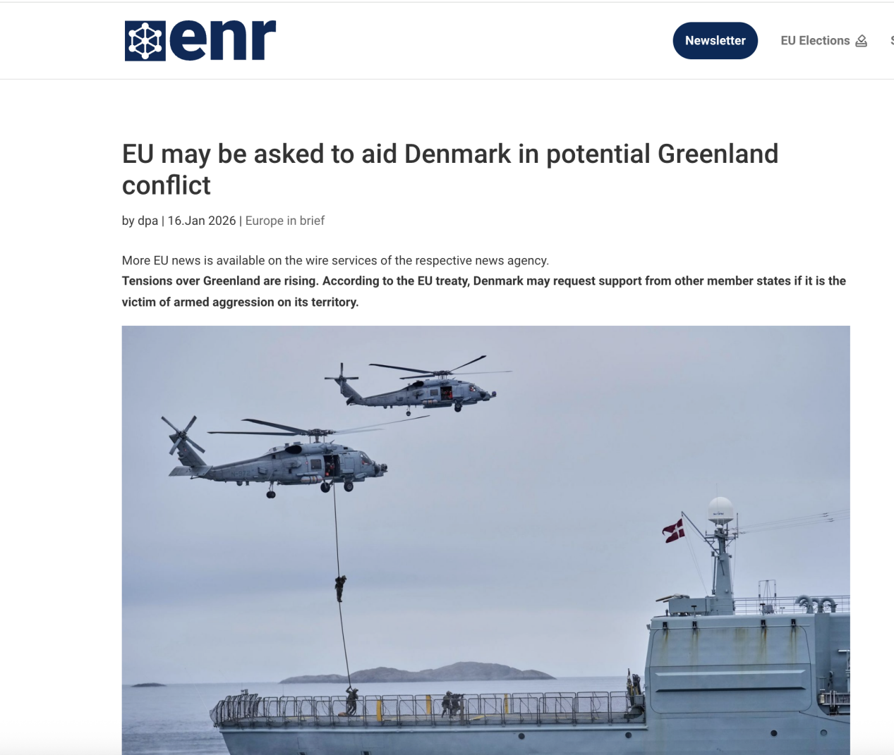 欧盟外交与安全政策高级代表卡拉斯的发言人1月15日在美丹格三方谈判破裂后表示,如果格陵兰岛爆发暴力冲突,德国和其他欧盟成员国可能有义务应丹麦的请求提供援助。该发言人称,格陵兰岛是丹麦王国领土的一部分,因此原则上受《欧盟条约》第42条第七款共同防御条款约束。