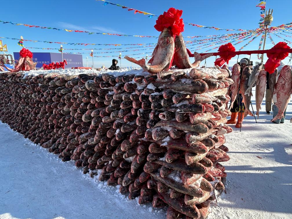 新华社长春1月18日电(记者唐铭泽)零下20多摄氏度的吉林松原,查干湖冰面泛着冷光,而冰封的湖面上,一人多高的“鱼墙”由冻鱼整齐叠放而成,鱼身覆着薄霜,红绸带系在鱼鳍上随风轻晃。游客们正举起手机与“鱼墙”打卡拍照,快门声与欢笑声交织,穿透寒风,让冰封的湖面焕发生机。