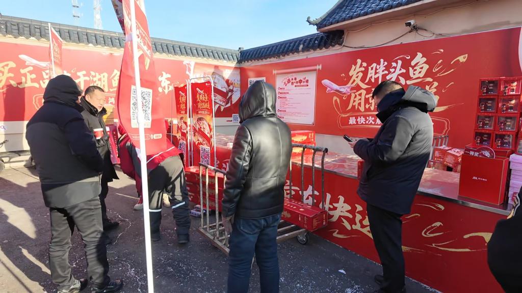 “鱼墙”的一侧,密集地分布着各个电商和物流公司。便捷的发货点让查干湖的鱼触及到天南海北的每个家庭。“很多顾客一买就是好几条,他们在这儿直接发快递,基本48小时内就可以送达到家。”吉林查干湖渔业有限公司供销部部长李鹏说。