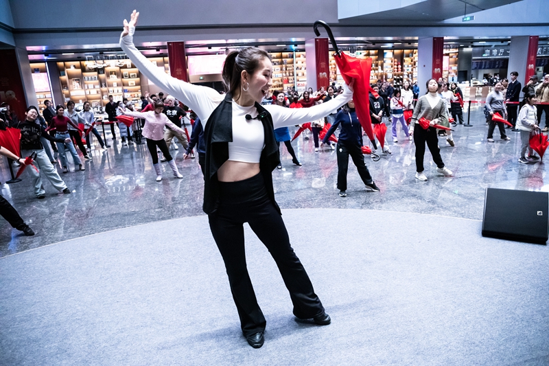 在工作坊现场,中央音乐学院声乐歌剧系舞蹈副教授刘佳亲自指导,带领观众们开合雨伞、跳跃旋转,从简至繁逐步学习剧中经典舞段。