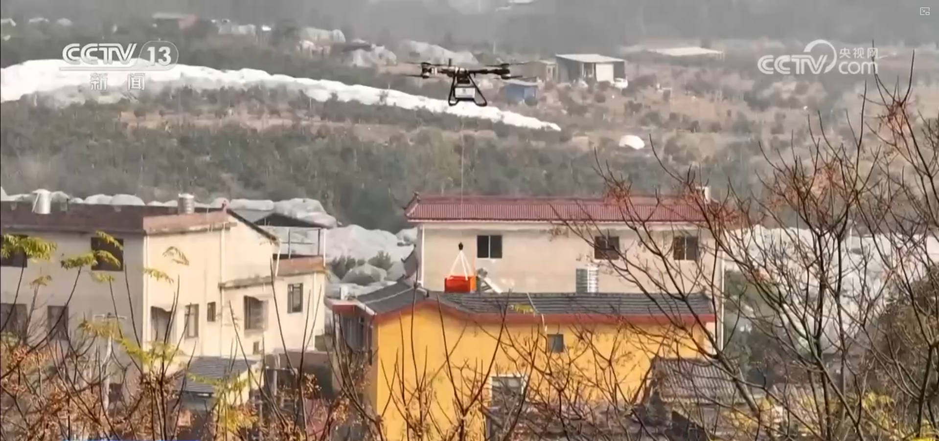 首先,跟随画面来到果园。新鲜的砂糖橘被采摘下来后,无人机就化身“空中邮差”,轻松跨越地理阻隔,将它们快速送出果园。据果农介绍,过去要半个多小时的路程,现在无人机只要十多分钟,既省时又高效。