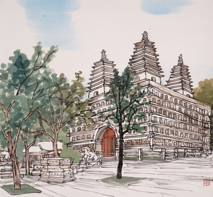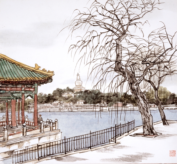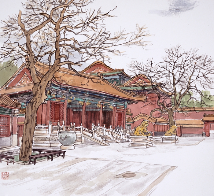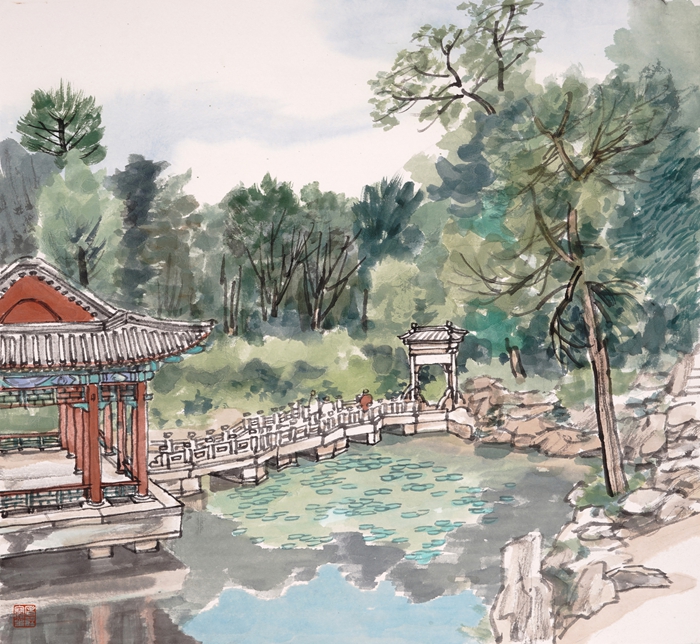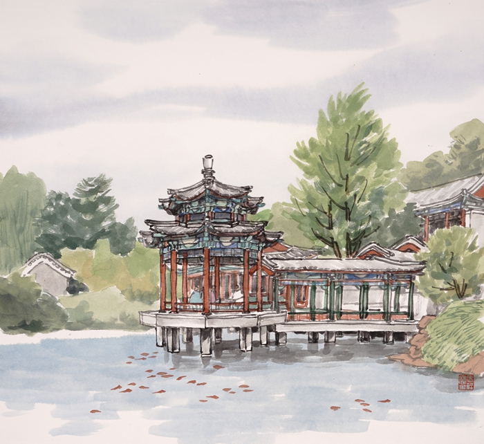近年来,庄小雷将创作重心转向北京园林,形成了与早期北方山水迥异的清新风格。“因为疫情期间不能到更远的地方去,我就开始画北京园林。”他探索将西方绘画中的色彩与中国画的线相结合,形成新的表现语言。北京皇家园林的庄重宏伟与南方文人园林迥异,而皇家园林建筑美学是世界独一无二的。迄今为止,庄小雷几乎画遍了北京所有对外开放的园林,这几年下来北京园林他就画了800余张,仅北海公园就画了百余张。庄小雷经常独自带上面包和水,在园林中一画一天,虽然辛苦,却乐在其中。他非常强调现场写生的重要性:“古人画画是心记下来,用程式方法往上套。但在现场写生更生动,同时也可以移花接木,腾转挪移。这也是个再创造的过程。”