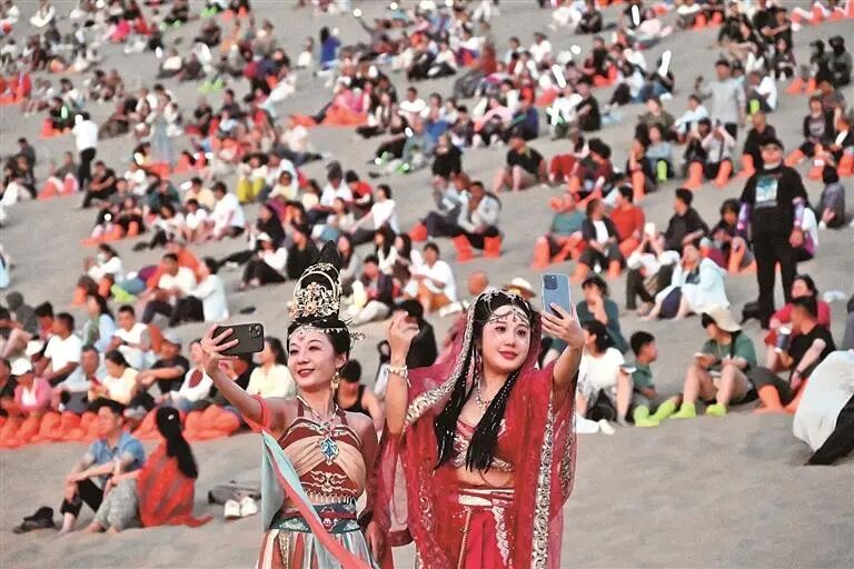 甘肃敦煌鸣沙山月牙泉星空演唱活动常态化运行。新华社发