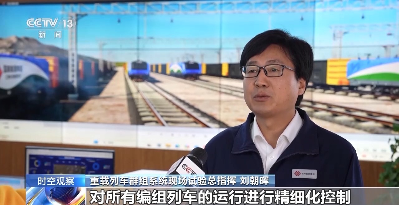 重载列车群组系统现场试验总指挥 刘朝晖:这套编队控制系统就像大脑里“神经中枢”,对所有编组列车的运行进行精细化控制。多列重载列车编队运行,就好像驾驶汽车时候,能够跟前车保持一个基本相同的速度,前车加速,我们也加速;前车刹车,我们也刹车。可以更进一步缩短车与车之间的间隔,让重载列车的间隔距离从此前的4公里,压缩到1公里左右,时间上也从原来的10分钟以上,压缩到了目前的5分钟内,实现了7列车“无线牵手”组队高效运行。