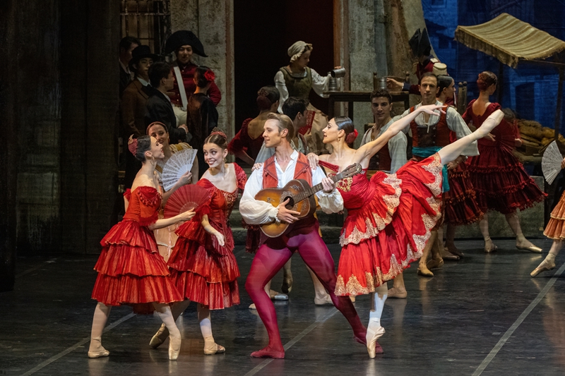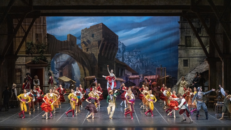 伴随着大幕徐徐拉开,观众们跟随着梦幻骑士堂·吉诃德的冒险之旅来到了美丽的巴塞罗那,富有油画质感的布景勾勒出热闹的城市广场,充满活力的各色人物纷纷登场,扑面而来的生活气息让人们感受到西班牙独有的活力与奔放,以及这部芭蕾舞剧的鲜明特色。与芭蕾艺术常见的宫廷仙幻题材不同,《堂·吉诃德》是芭蕾史上为数不多的充满人间烟火气的大型作品,轻盈的足尖不再为演绎飘逸的仙女而是踏上坚实的地面为塑造一个个鲜活的市井人物而旋转跳跃。