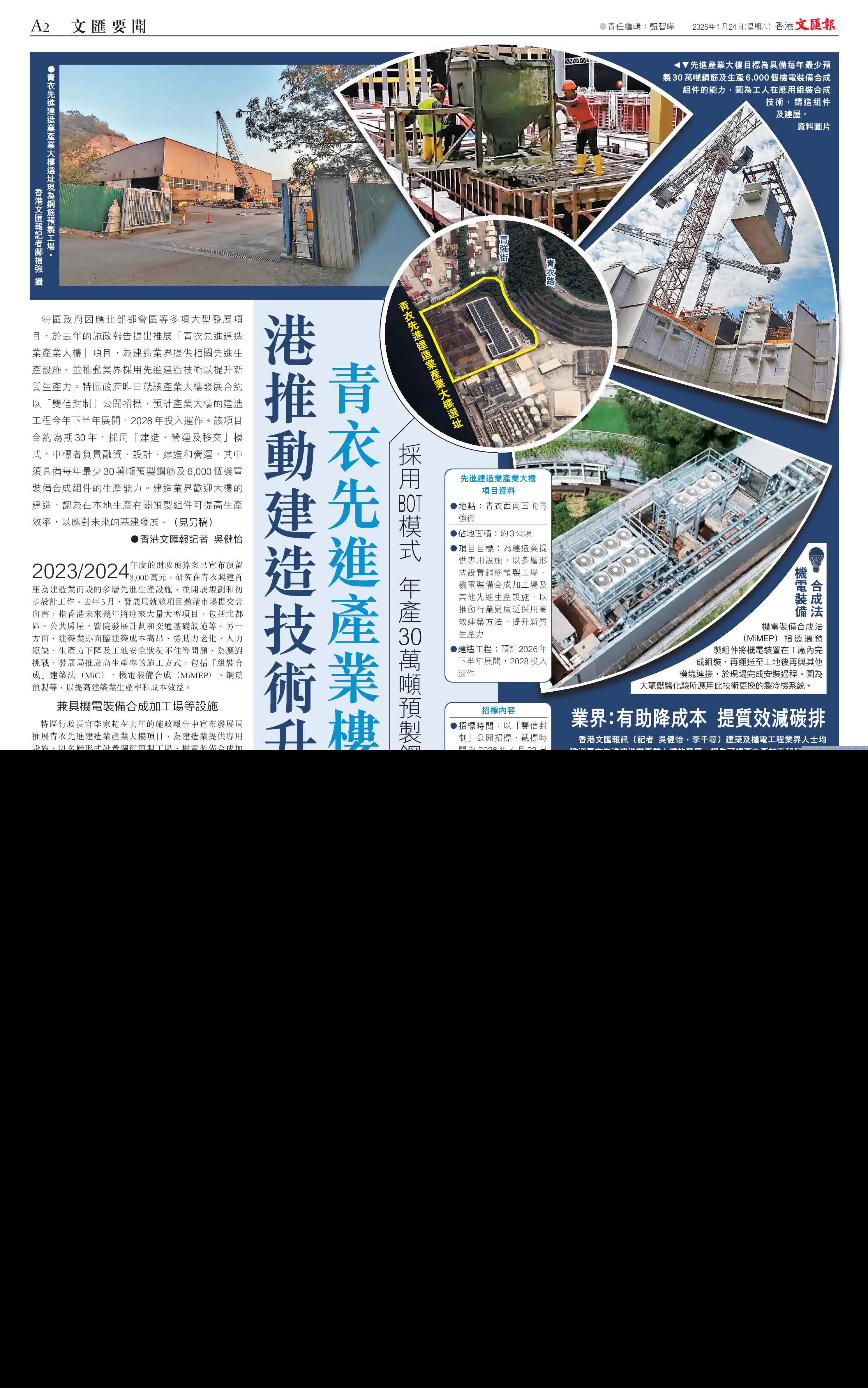 2023/2024年度的財政預算案已宣布預留3,000萬元,研究在青衣興建首座為建造業而設的多層先進生產設施,並開展規劃和初步設計工作。去年5月,發展局就該項目邀請市場提交意向書,指香港未來幾年將迎來大量大型項目,包括北都區、公共房屋、醫院發展計劃和交通基礎設施等。另一方面,建築業亦面臨建築成本高昂、勞動力老化、人力短缺、生產力下降及工地安全狀況不佳等問題,為應對挑戰,發展局推廣高生產率的施工方式,包括「組裝合成」建築法(MiC)、機電裝備合成(MiMEP)、鋼筋預製等,以提高建築業生產率和成本效益。