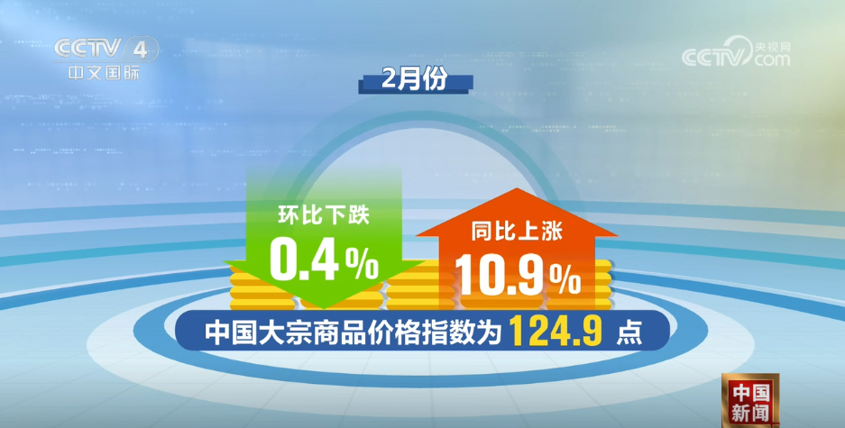 2月份中国大宗商品价格指数为124.9点,环比下跌0.4%,同比上涨10.9%。在中国物流与采购联合会重点监测的50种大宗商品中,2月价格环比上涨的大宗商品有24种。其中,氧化镨钕、丁苯橡胶和聚氯乙烯涨幅居前,较上月环比分别上涨24.3%、5.4%和3.5%。