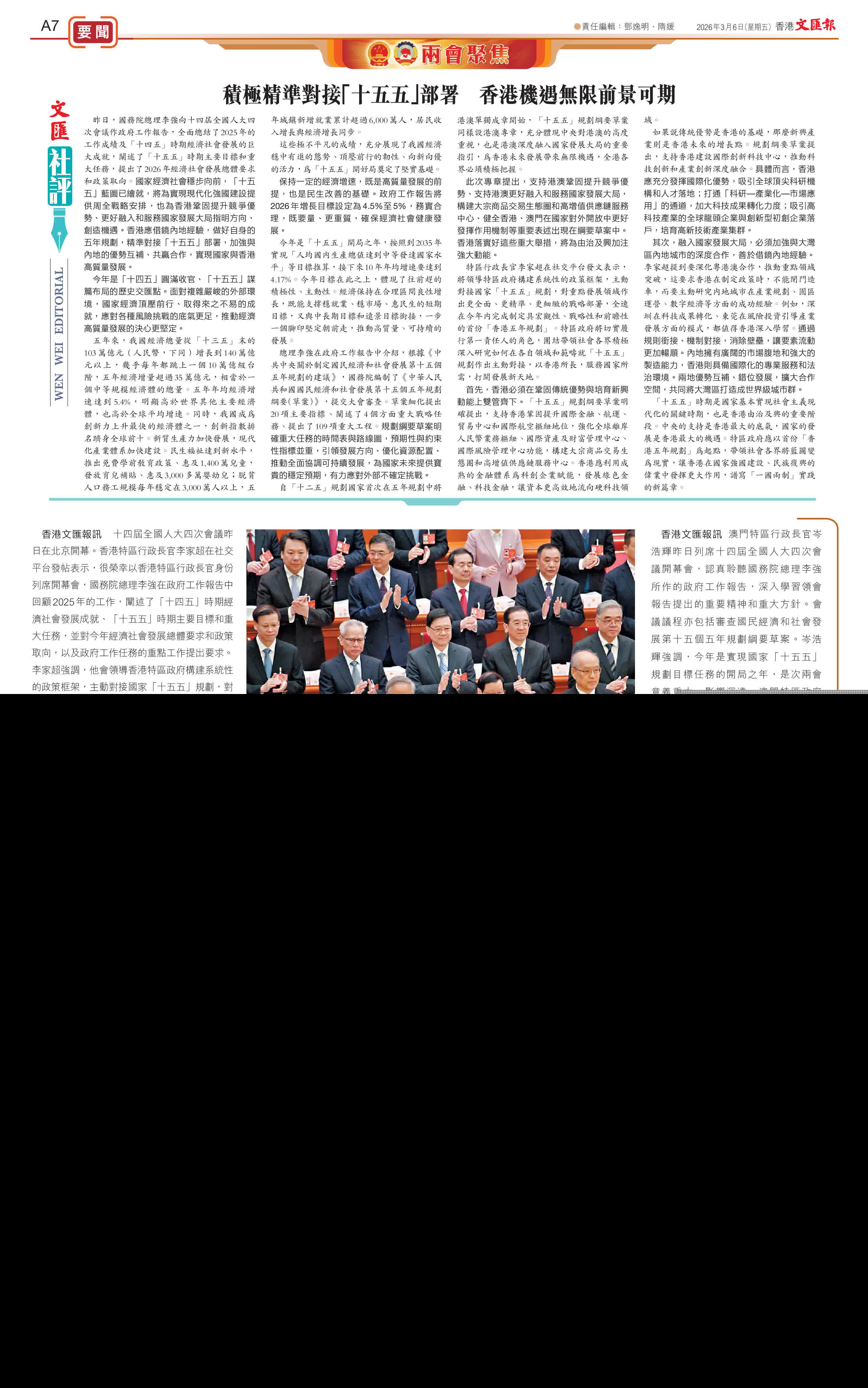 香港文匯報訊 十四屆全國人大四次會議昨日在北京開幕。香港特區行政長官李家超在社交平台發帖表示,很榮幸以香港特區行政長官身份列席開幕會,國務院總理李強在政府工作報告中回顧2025年的工作,闡述了「十四五」時期經濟社會發展成就、「十五五」時期主要目標和重大任務,並對今年經濟社會發展總體要求和政策取向,以及政府工作任務的重點工作提出要求。李家超強調,他會領導香港特區政府構建系統性的政策框架,主動對接國家「十五五」規劃,對重點發展領域作出更全面、更精準、更細緻的戰略部署,並制定具宏觀性、戰略性和前瞻性的首份「香港五年規劃」。香港會持續提升國際競爭力,深化國際交往合作,強化內聯外通的橋樑作用,實現香港更好發展,為強國建設、民族復興偉業作出更大貢獻。