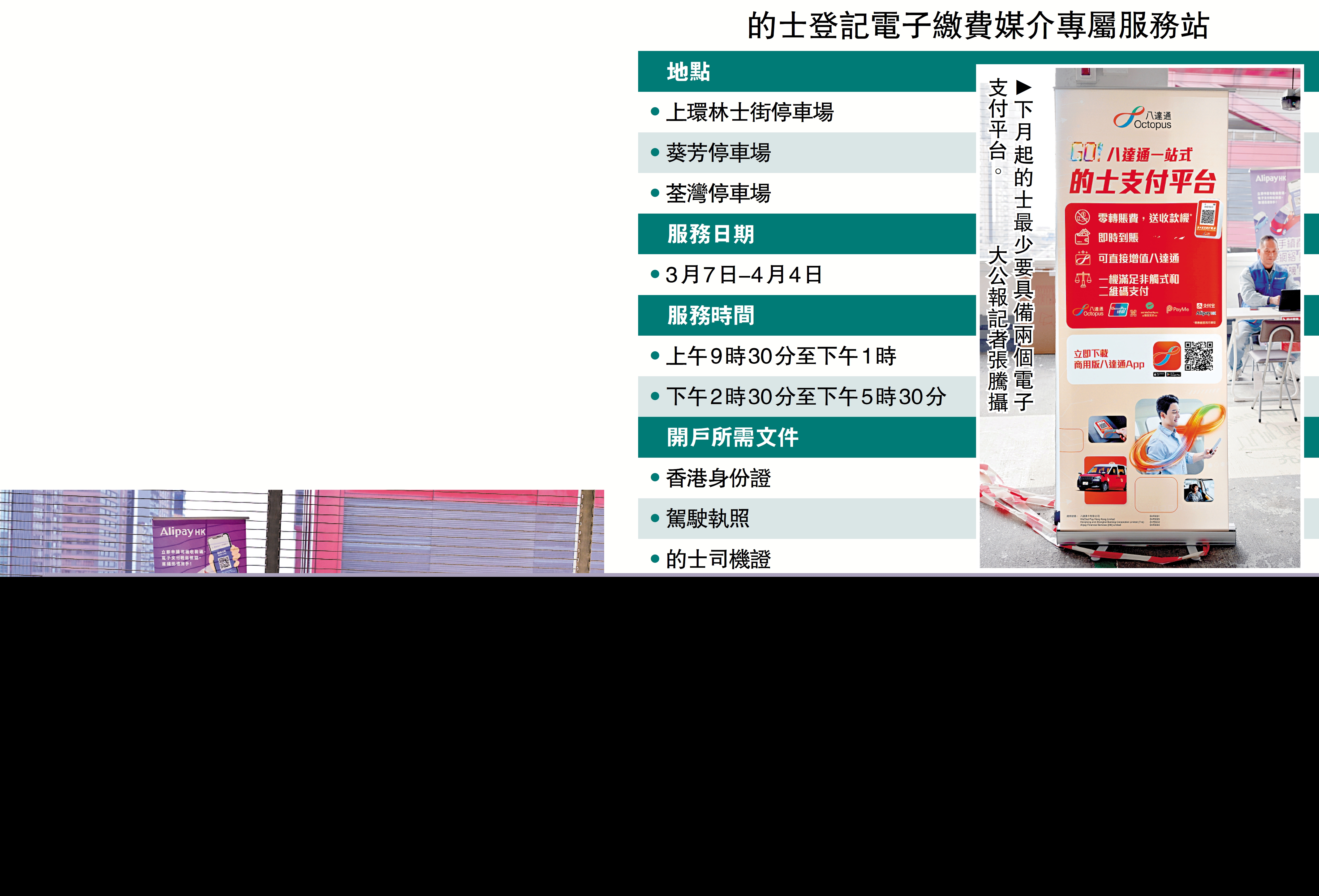 運輸署昨日回覆大公報查詢表示,一直鼓勵和協調各主要電子繳費媒介平台舉辦活動,協助的士司機開立電子繳費媒介戶口,以及指導他們如何透過電子媒介收取車費和查閱收費紀錄。除專屬服務站外,還會有兩場工作坊,將分別在西營盤(3月11日)和油麻地(3月20日)舉行。該署呼籲未安裝電子繳費媒介的司機,盡快預約登記。該署會繼續透過不同渠道,加大力度宣傳和教育的士司機提供電子繳費媒介予乘客繳付車費。