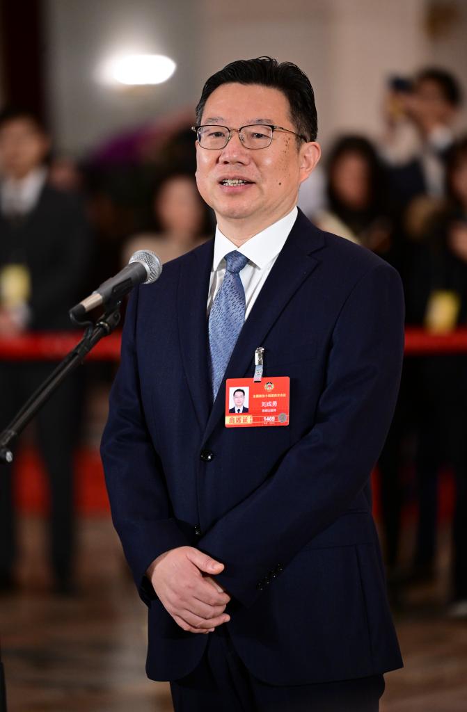 3月11日,全国政协十四届四次会议第三场“委员通道”集体采访活动在北京人民大会堂举行。这是全国政协委员刘成勇接受媒体采访。新华社记者 陈晔华 摄