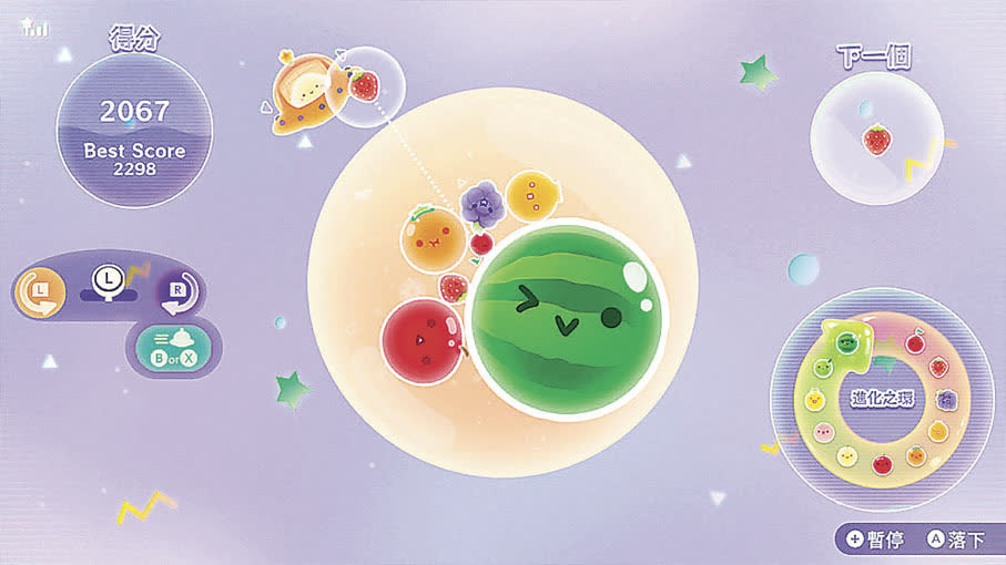 簡單易懂的玩法,可愛治癒的畫面,以及即時的成就感,正是《西瓜遊戲Planet》給玩家留下的印象。玩法承襲自前作《西瓜遊戲》,只需要將相同種類的水果相撞進行「進化」,就可以不斷合成更高級的水果,依照順序由低到高分別為櫻桃、草莓、葡萄、蜜柑、柿子、蘋果、梨子、桃子、鳳梨、甜瓜、西瓜。與前作不同,以往方形的盒子空間變為可以從360°任意方向投下水果至中心的圓形空間,難度有所降低,賦予玩家更多操作空間。當水果大量「進化」後,遊戲就會進入新模式「超級進化時間」,此時背景音樂變得歡快激昂,水果也會亮出燦爛笑容。在「超級進化時間」不僅可以獲得額外分數,期間每進行一次「進化」就會重置倒計時,因此理論上玩家可以將「超級進化時間」無限延長,獲得無盡的歡樂。不過,若是空間內的水果超出一定範圍,遊戲就會宣告失敗。嘗試像多米諾骨牌一樣,通過連鎖反應一次性合成多個水果,感受煩惱與壓力隨水果一併消失的快樂。《西瓜遊戲Planet》售價15元,可在手機(iOS、Android)、NS、NS2上遊玩。