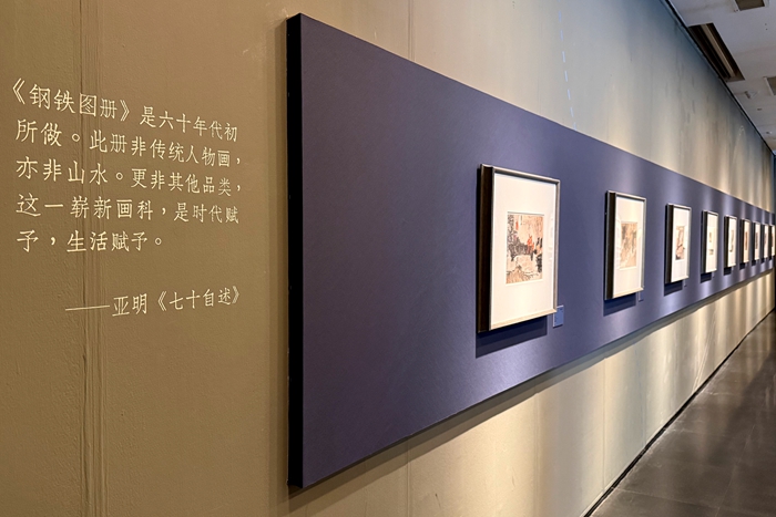 北京画院美术馆一楼展厅的正中心有一组特殊的展品,是由10件亚明的画作组成的《钢铁捃拾集》。这是亚明在重庆钢铁厂和武汉钢铁公司参观取材后完成的一组写生创作,展现了“铁水钢花”的冶炼过程和生产氛围。这组作品将中国画水墨渲染和纸面的空白巧妙结合,呈现炉火的反光,将钢铁厂中热火朝天的场面表现出来。用亚明自己的话来说:“此册非传统人物画,亦非山水。更非其他品类,这一崭新画科,是时代赋予,生活赋予。”