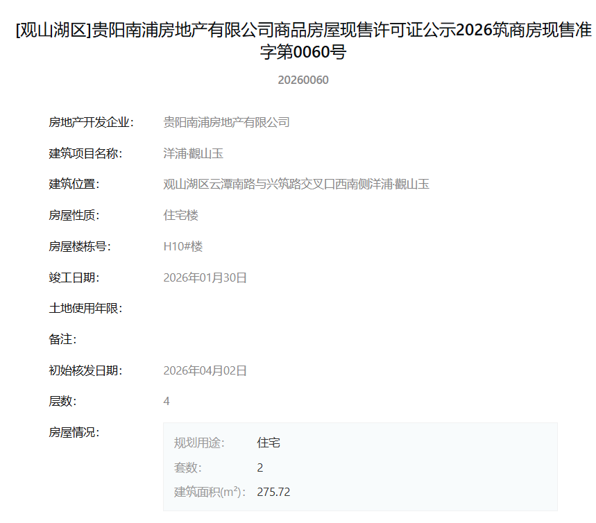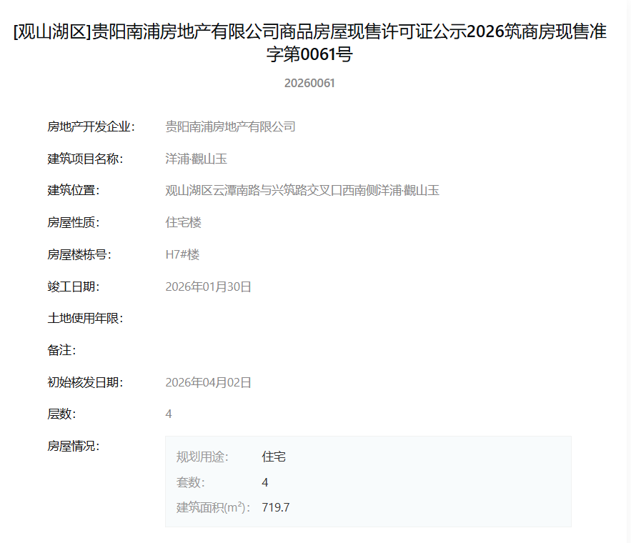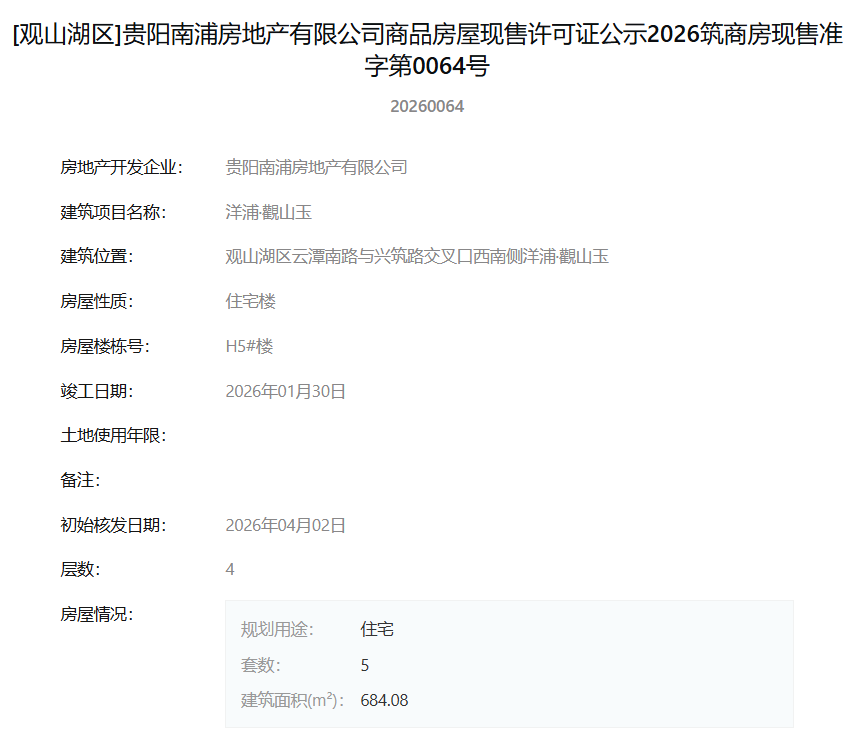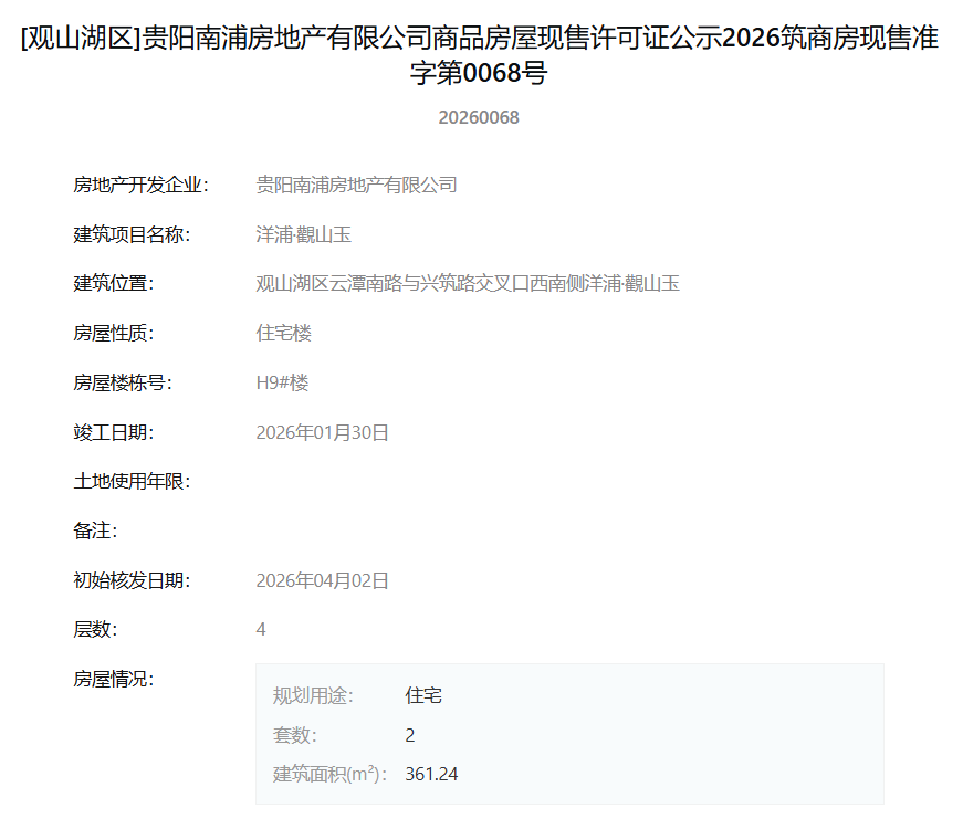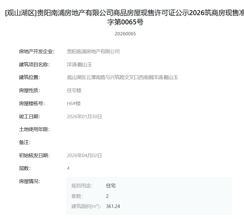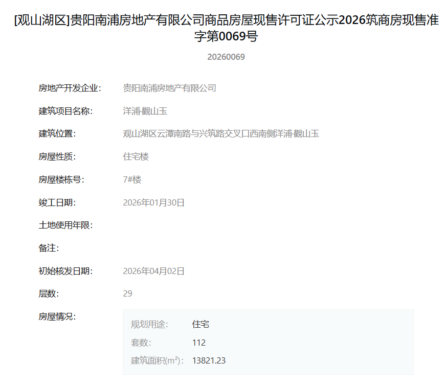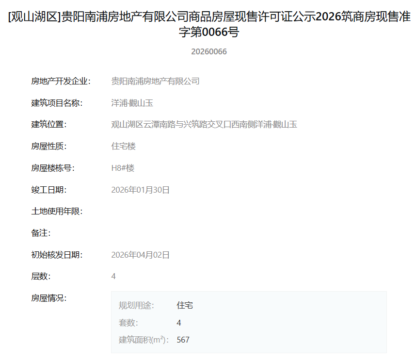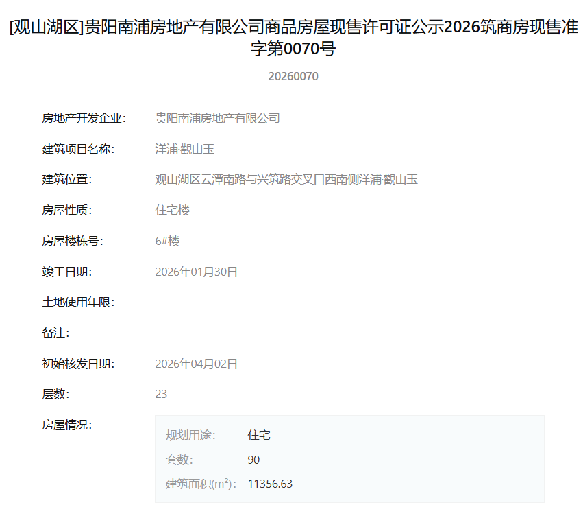 4月7日,据筑房网官方公示信息显示,贵阳南浦房地产有限公司旗下项目“洋浦·觀山玉”一次性获得12张商品房屋现售许可证,标志着该项目一批新房源达到法定销售条件,即将正式入市。