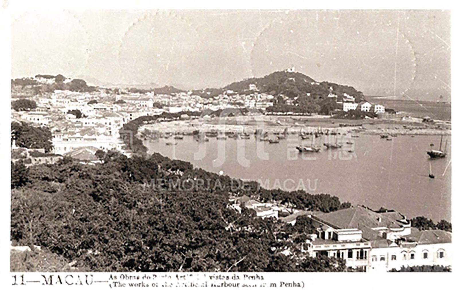 南灣東部填海工程於1931年到1938年進行,圖中可見,從嘉思欄炮台到政府合署大廈前的一帶海面,近半個南灣填成陸地。(利冠棉收藏,澳門歷史教育學會提供,摘自「 澳門記憶 」文史網)